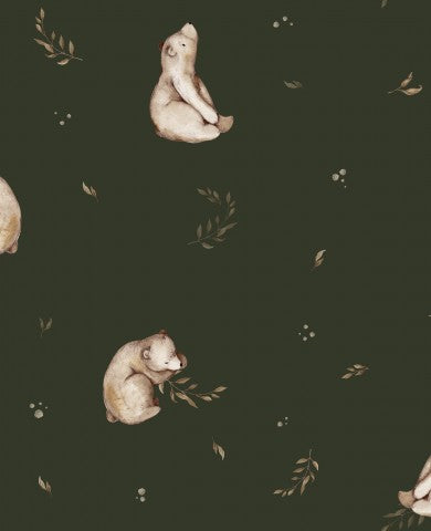Satin cotton a pattern of bears and leaves on dark green fabric