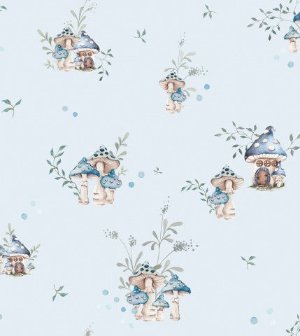 Rib Jersey a blue and white wallpaper with mushrooms and plants