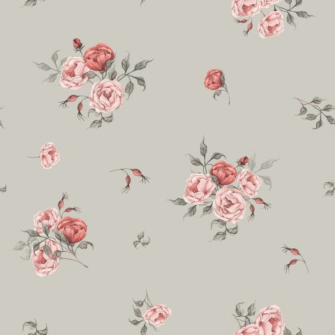French Terry, un papier peint floral avec des roses roses sur fond gris