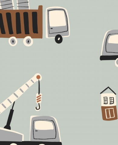 Questo design presenta un'illustrazione di veicoli da costruzione e una gru.