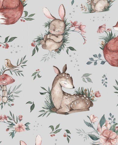 Questo design presenta un motivo senza cuciture con animali e fiori del bosco.