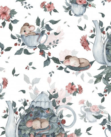 Questo design presenta un motivo con topi in teiere e fiori.