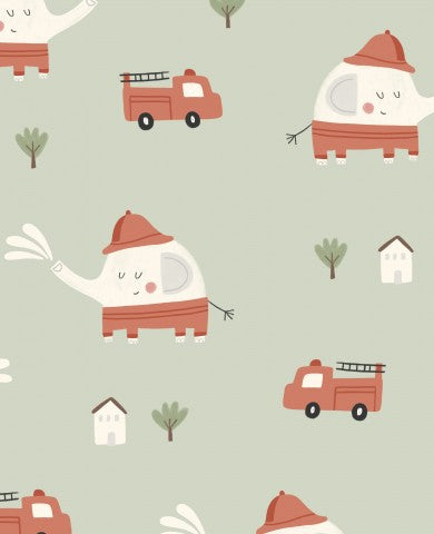 Questo disegno presenta un motivo senza cuciture con elefanti e un'autopompa.