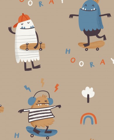 Questo disegno presenta un motivo senza cuciture con mostri sugli skateboard.