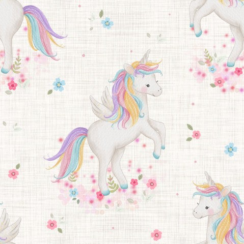 Questo modello presenta un motivo senza cuciture con unicorni e fiori.