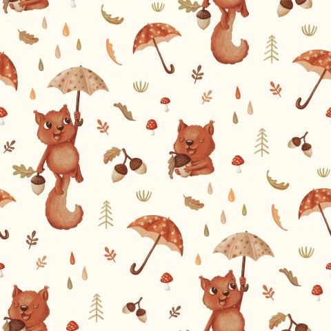 Questo modello presenta un motivo senza cuciture con scoiattoli e ombrelli.