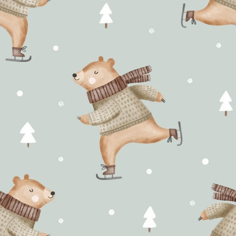Motivo French Terry raffigurante un orso bruno con maglione e sciarpa