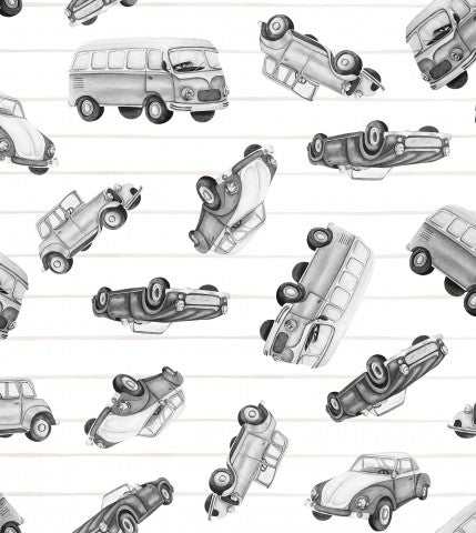 Questo design presenta un motivo bianco e nero di auto e camion.