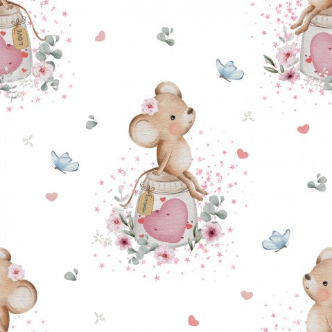 Questo modello presenta un motivo senza cuciture con simpatici topolini in un barattolo.