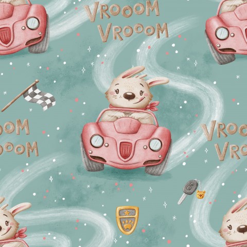 Questo disegno presenta un motivo senza cuciture con un coniglio alla guida di un'auto.