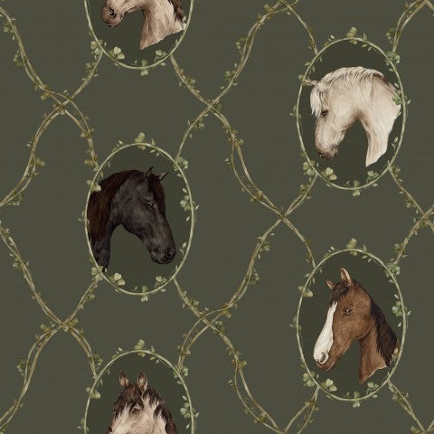 Questo design presenta un motivo di cavalli su uno sfondo verde.