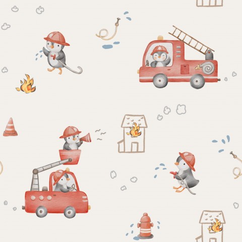 Questo design presenta un motivo senza cuciture con pompieri e autopompe.