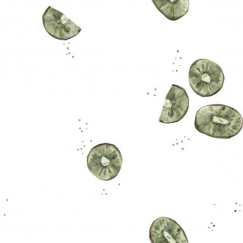 Questo disegno presenta un motivo senza cuciture con fette di kiwi su sfondo bianco.