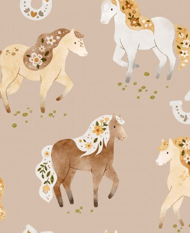 Questo modello presenta un motivo senza cuciture con cavalli e fiori.