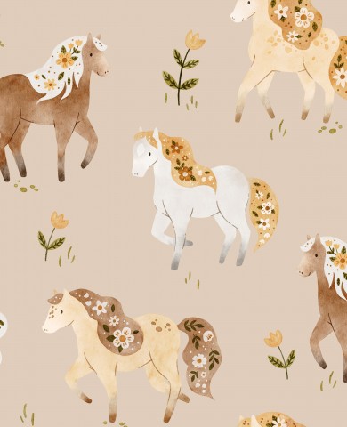 Questo design presenta un motivo senza cuciture con cavalli su uno sfondo beige.