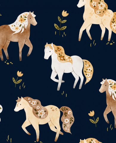 Questo modello presenta un motivo senza cuciture con cavalli su uno sfondo scuro.