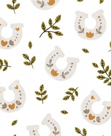 Questo disegno presenta un motivo senza cuciture con ferri di cavallo e foglie.