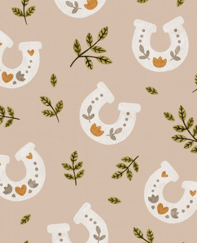 Questo disegno presenta un motivo senza cuciture con ferri di cavallo e foglie.