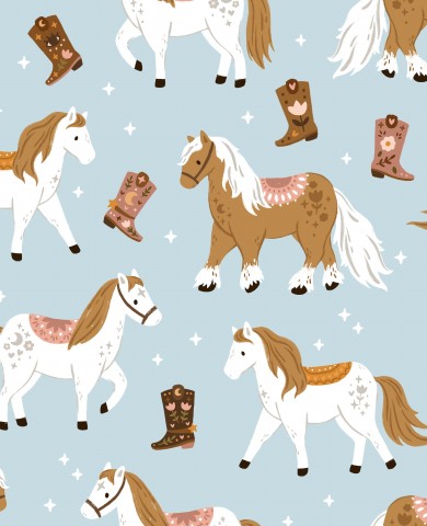 Questo disegno presenta un motivo con cavalli e stivali su uno sfondo blu.