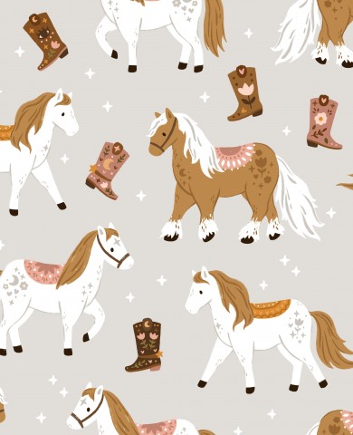 Questo modello presenta un motivo senza cuciture con cavalli e stivali.
