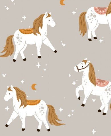 Questo disegno presenta un motivo senza cuciture con cavalli su uno sfondo grigio.