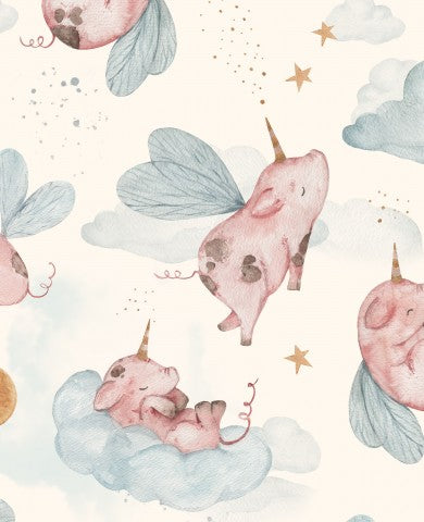 Questo design presenta un motivo senza cuciture con maialini rosa che volano sulle nuvole.