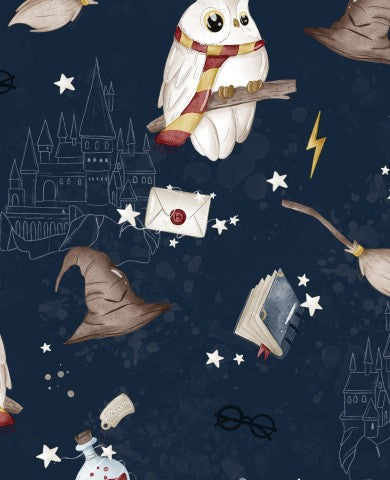 Tessuto di cotone satinato con motivi di Harry Potter, gufi e altri oggetti