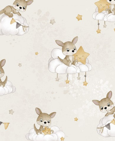 Questo modello presenta un motivo senza cuciture con graziosi canguri e stelle.