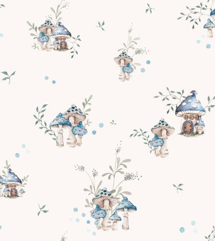 Carta da parati in tessuto impermeabile con funghi blu e fiori bianchi