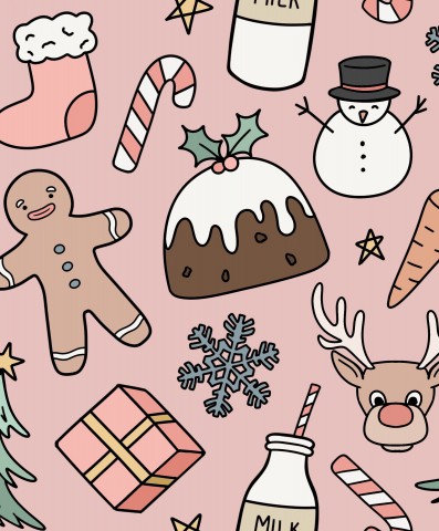 Questo modello presenta un motivo senza cuciture con simboli natalizi su uno sfondo rosa.