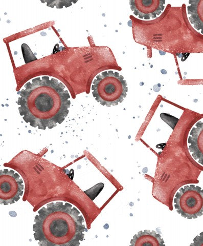 Questo disegno presenta un motivo acquerello senza soluzione di continuità di trattori rossi.