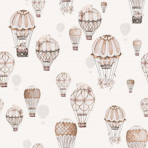 Questo design presenta un motivo di mongolfiere su sfondo bianco.