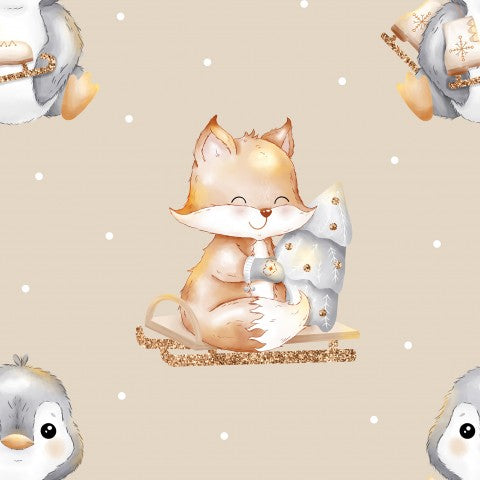 Questo design presenta un motivo senza cuciture con graziose volpi e pinguini.