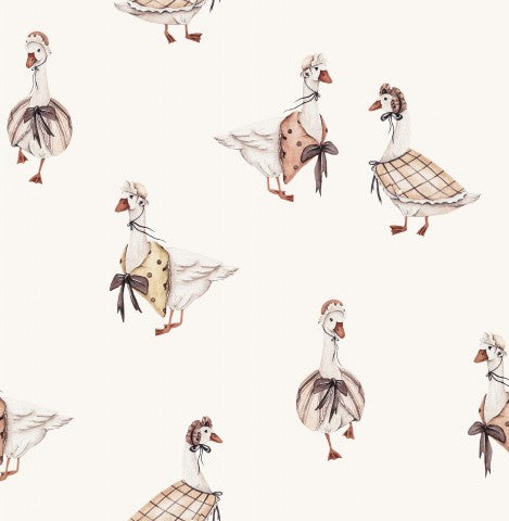 Questo design presenta un motivo senza cuciture di anatre e oche su sfondo bianco.