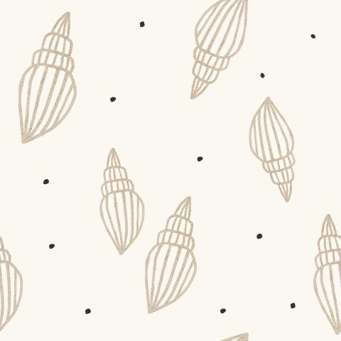 Questo design presenta un motivo senza cuciture con conchiglie e pois su uno sfondo bianco.