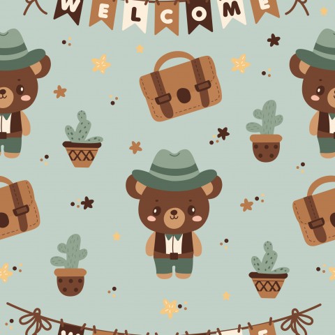 Questo modello presenta un motivo senza cuciture con graziosi orsacchiotti e un cartello di benvenuto.