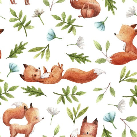 Dieses Design zeigt ein nahtloses Muster mit Füchsen und Blumen.