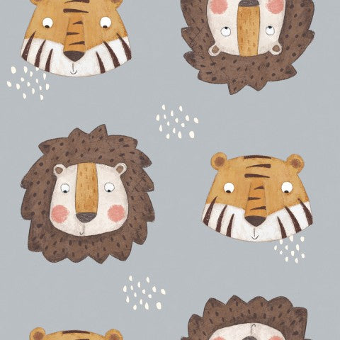 Dieses Design zeigt ein nahtloses Muster von Cartoon-Tieren auf grauem Hintergrund.