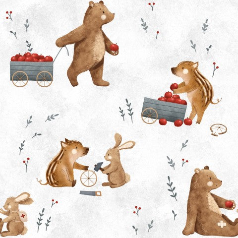 Dieses Design zeigt ein Muster mit Tieren und Äpfeln.