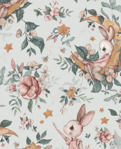 Dieses Design zeigt ein Hasen- und Blumenmuster auf weißem Hintergrund.