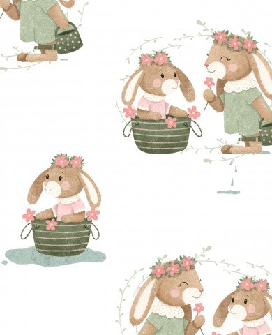 Dieses Design zeigt Häschen in Körben mit Blumen und Blüten.