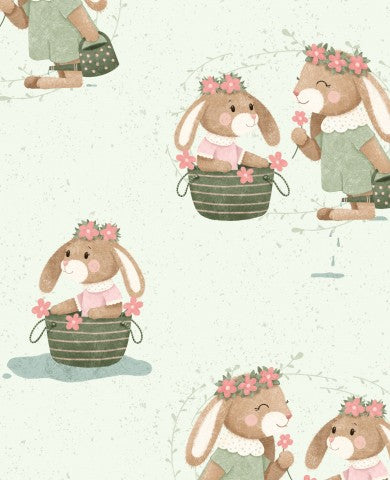 Dieses Design zeigt Häschen in Körben mit Blumen darauf.