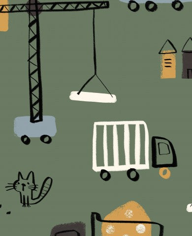 Dieses Design zeigt eine Illustration von Bauarbeitern und Lastwagen auf grünem Hintergrund.