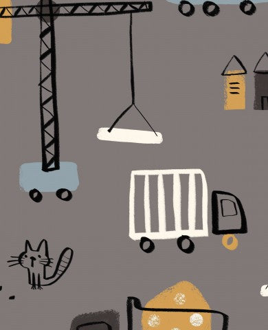 Dieses Design zeigt ein Muster aus Baufahrzeugen und Lastwagen auf grauem Hintergrund.