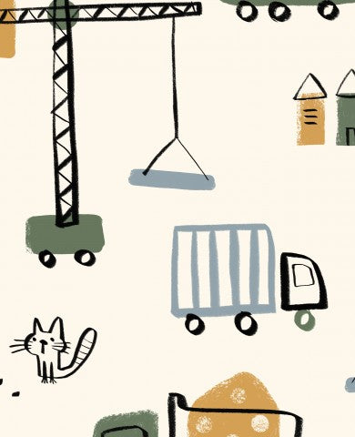 Dieses Design zeigt ein Muster mit Baufahrzeugen und einer Katze.