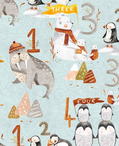Dieses Design zeigt ein Muster mit Pinguinen, Eisbären und Zahlen.