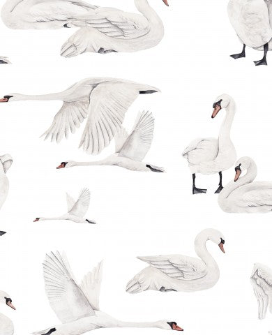 Dieses Design zeigt ein nahtloses Muster mit Schwänen auf weißem Hintergrund.