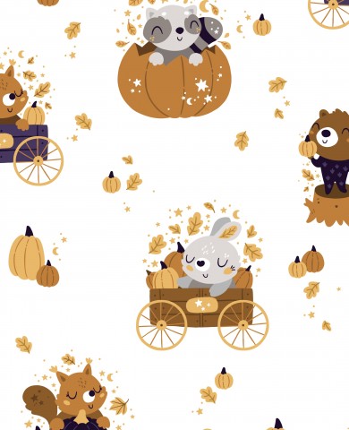 Dieses Design zeigt ein nahtloses Muster mit niedlichen Tieren und Kürbissen.