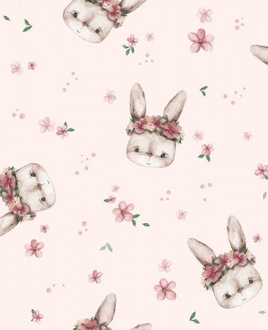 Dieses Design zeigt ein nahtloses Muster mit Kaninchen und Blumen auf rosa Hintergrund.