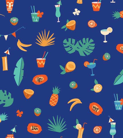 Dieses Design zeigt ein Muster aus tropischen Früchten und Getränken auf blauem Hintergrund.